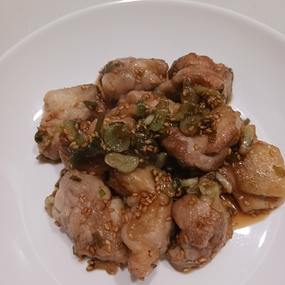 白髪ネギで!片栗粉大さじ2、2人分だから調味料は半分でいいけど味を見てポン酢を追加!なんか足りないから鶏がらスープの素を小さじ1追加!美味しい!